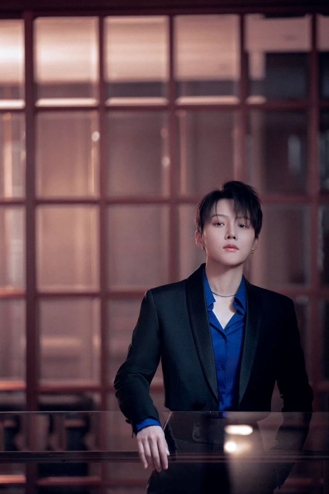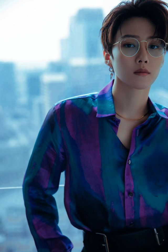刘雨昕一身西装搭配蓝色衬衣,勾勒出精瘦的腰和完美的身形。