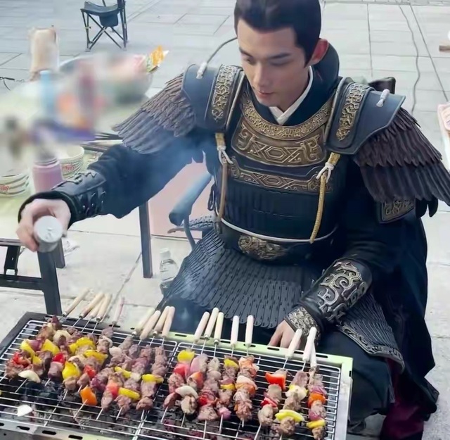 吴磊还是那副冷峻帅气的外表,穿着凌不疑的盔甲,却是坐在烤架后面,正在往烧烤架上放烤串。