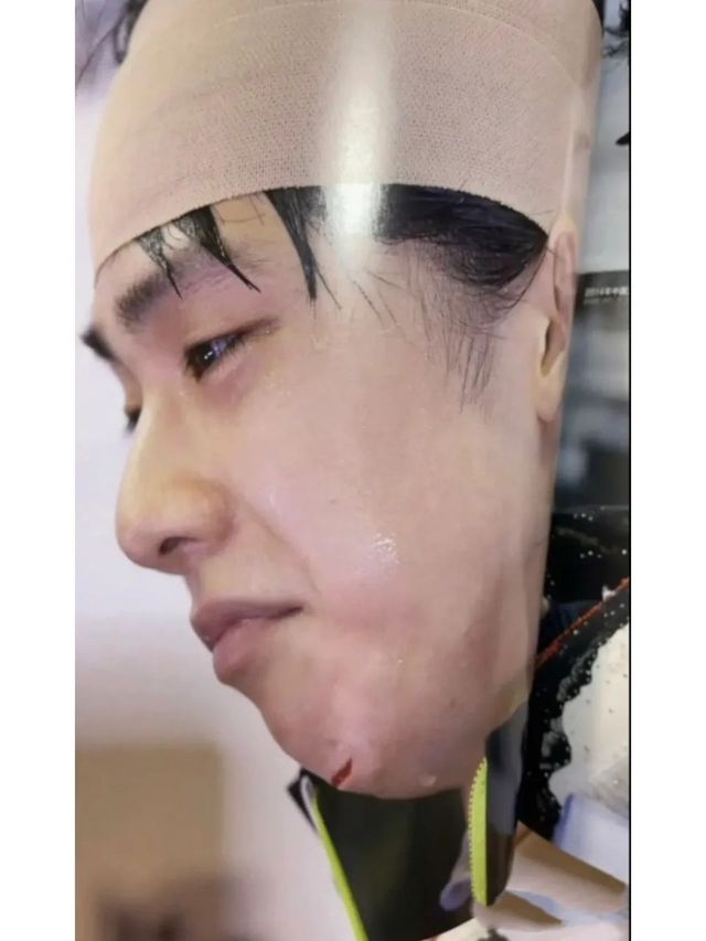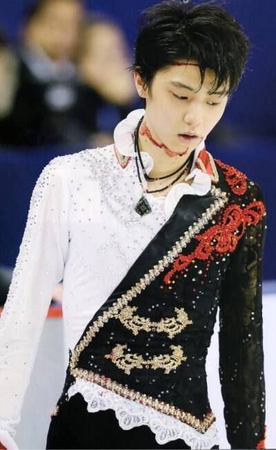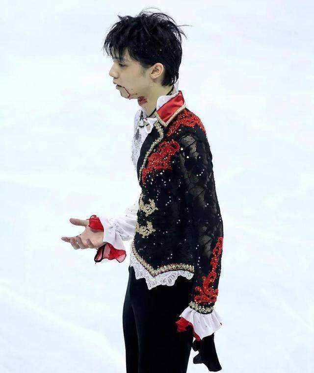 几分钟后,羽生结弦头上绑着绷带,下巴贴着创可贴重新来到了观众面前。