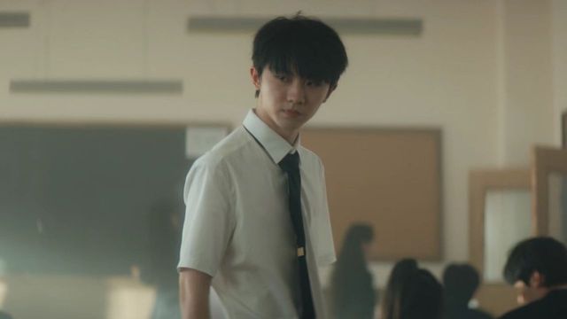 被那群男生围坐在中间的一位男生懒洋洋地升了个懒腰,坐在座位上仰着头,玩笑地看着板着脸的马嘉祺.