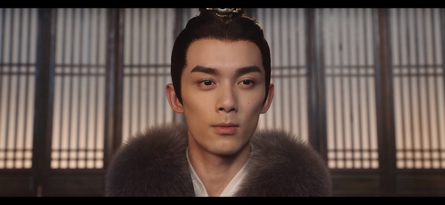 楼阁上的男人眉眼深邃,神情淡漠,遗世而独立。