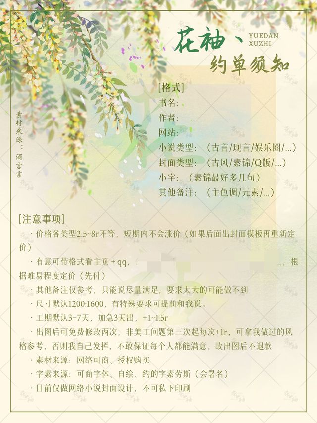 花袖丶不过现在我正在学做小说封面模板(晋江的那种),意思就是封面素材都是我真金白银买的,版权保证;一种设计只卖一次,底图完全由我自己整合。这种就会贵一点,一般会有15r左右