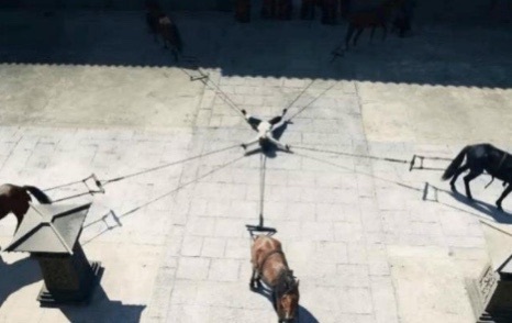 偌大的芈玥城中,一个小小的角落,一个穿着囚服,满身伤痕,披头散发的少女的手、脚、头分别被五匹马绑着,整个人悬浮在空中,发疯似的挣扎,不停的叫喊着。