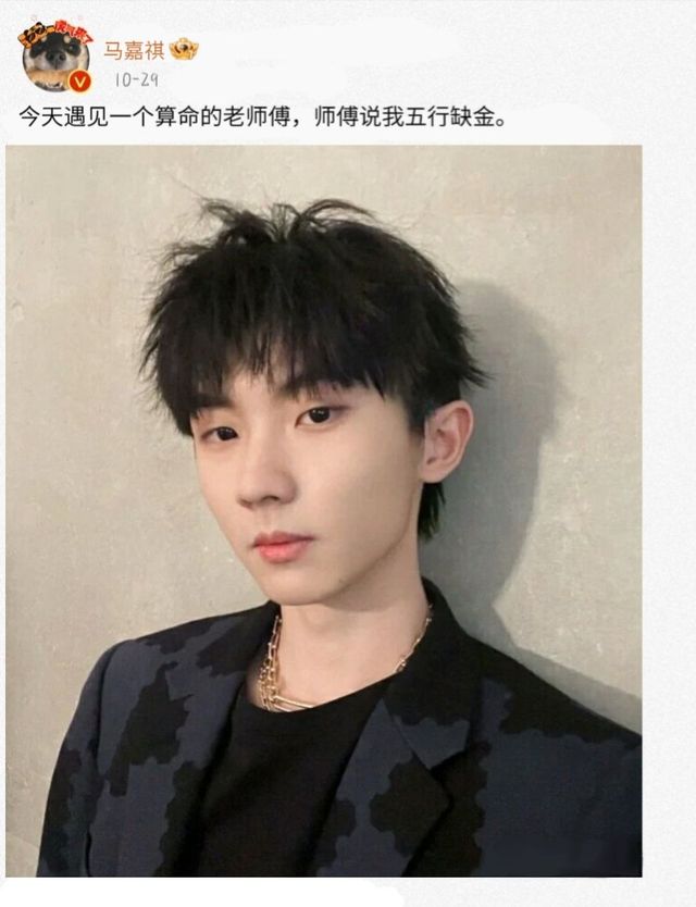 马嘉祺靠着车,在相册里随便找了张自拍发了个微博.