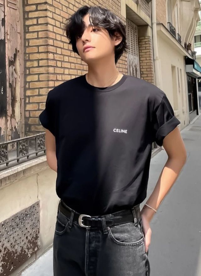 他今天穿了件简单的黑T,衣服下摆扎进了烟灰色的牛仔裤里,而我今天刚好也是类似打扮,白色的正肩T恤和深蓝牛仔裤。
