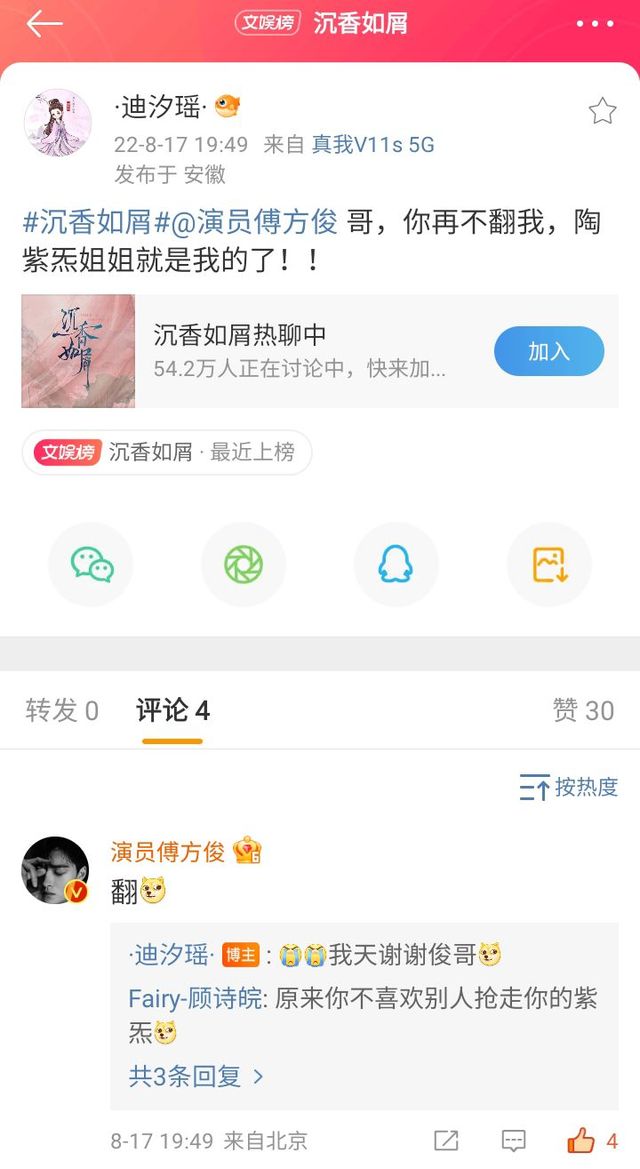 作者“迪汐瑶是19:49直接发了出去,傅方俊直接19:49翻了她,俊哥,你逮着迪汐瑶的帖子翻是吗?🌝🌝”