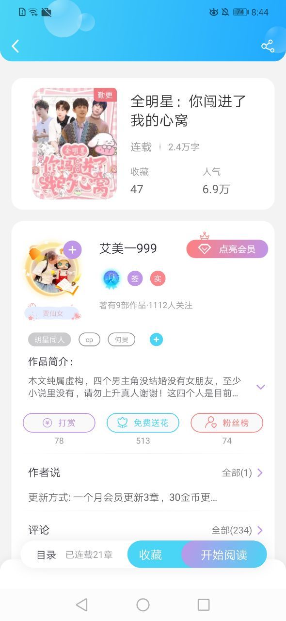 从简介中可以看出是四个故事,也是四个完全不同的类型,任君挑选!每一个故事也都是非常甜的,无虐,读者们可以放心去看!看了大大的一个人物简介,第一对是成年人的恋爱,所以节奏较快;第二对是年上小奶狗,这个设定我很爱哦,这种粘人又可爱的小奶狗还不垂直入坑啊!第三对感觉是个妻管严呀,就是很怕老婆的那种,这个设定也很可!第四对就比较正经吧,有种慢生活的感觉,现代的快节奏过久了,也可以看一看慢节奏的生活呀!这本书就是讲娱乐圈中的这四对夫妻的相见相识相爱,是在娱乐圈中开展的。