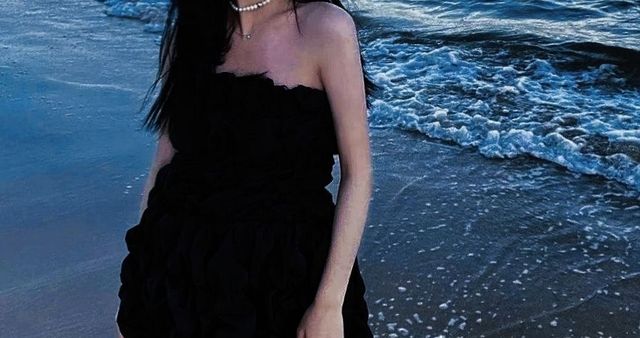 纤瘦的手臂配上黑色系的泡泡短裙,头发被风吹的凌乱,颈脖戴着一串珍珠项链。