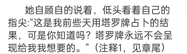 她自顾自的说着,低头看着自己的指尖:“这是我前些天用塔罗牌占卜的结果,可是你知道吗?塔罗牌永远不会呈现给我我想要的。”(注释1,见章尾)