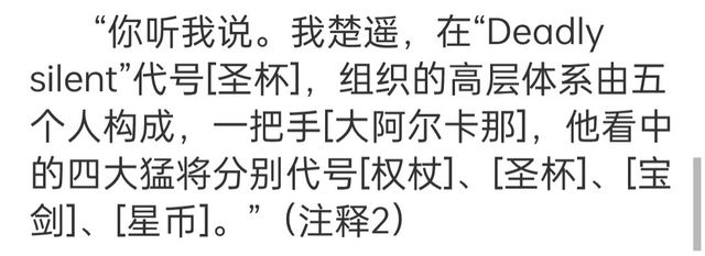 “你听我说。我楚遥,在“Deadly silent”代号[圣杯],组织的高层体系由五个人构成,一把手[大阿尔卡那],他看中的四大猛将分别代号[权杖]、[圣杯]、[宝剑]、[星币]。”(注释2)