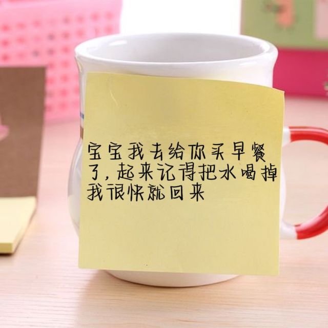 看到桌子上有一张便利贴和一杯水