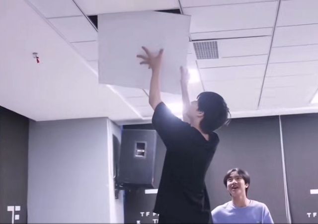 余宇涵踩着个凳子往上按天花板,剩下几个围在旁边不嫌事大,从那吃瓜。