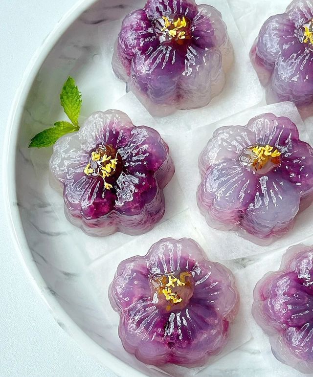 将西米放在榨汁机里磨成粉。再将紫薯去皮蒸熟,放入一点炼乳和代糖调味。