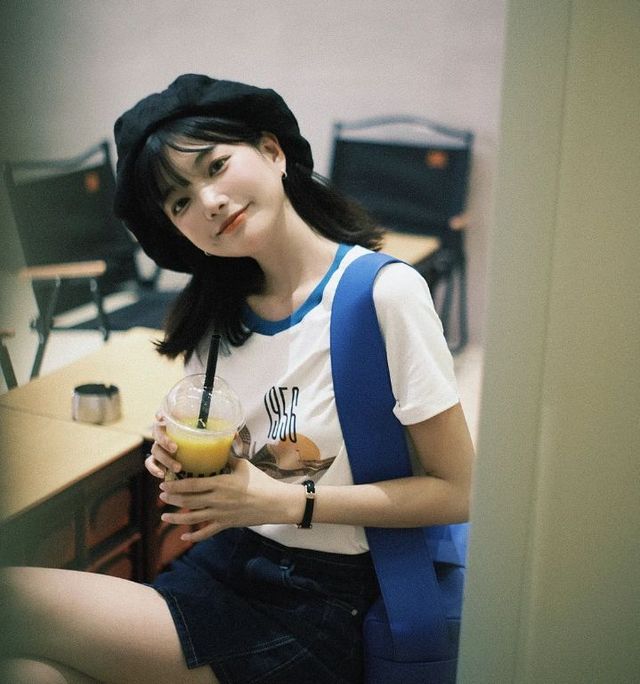 汤芷琦身着件普通短袖,牛仔短裙清爽又活力,涂了薄薄一层口红,显得乖巧动人。