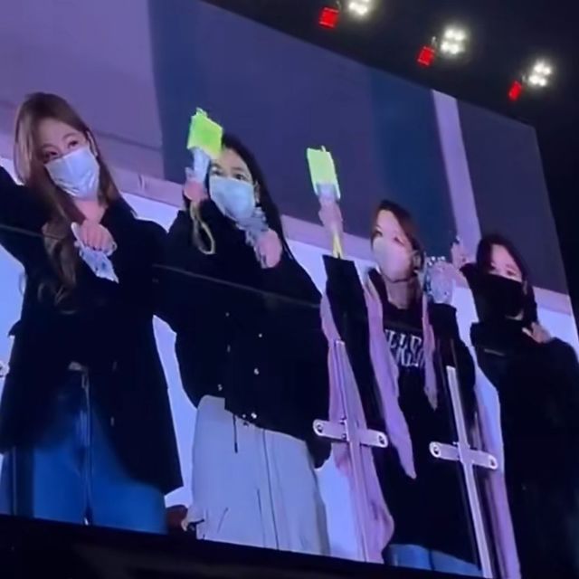 然后是一张她靠在栏杆比耶和他们舞台的合作,因为没有化妆所以戴了口罩头发因为活动结束染回来黑色把头发高高扎扎起来显得很有活力,穿着一身阿迪的经典套装。
