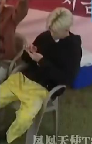摄像头在拍摄,无奈只能坐到了自己队伍的一边,在其他人正在看比赛时,自己在一旁悄悄拿出了手机,像在打字?