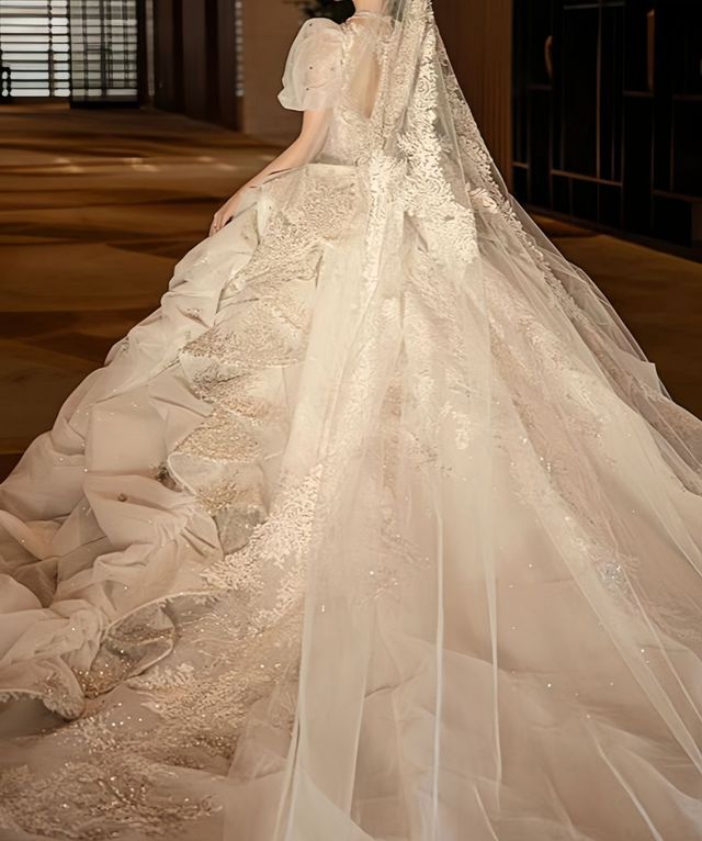 她穿上婚纱,纯白的裙摆被裁制成无数皱褶的裙子。一层轻纱柔柔的给褶皱裙上蒙上一层薄雾。袖口参差不齐的蕾丝花边更显柔美。剪裁得体的婚纱,蓬起的裙摆,让她如同云间的公主,优雅而华丽