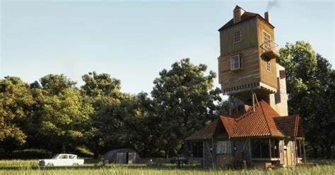韦斯莱家的房子建造的很简陋,一个平房上面用一些粗壮的木棍顶起了额外加盖的房子,很明显能看出来原先只有这一个平房。后来孩子越来越多之后,房间就往上加盖。