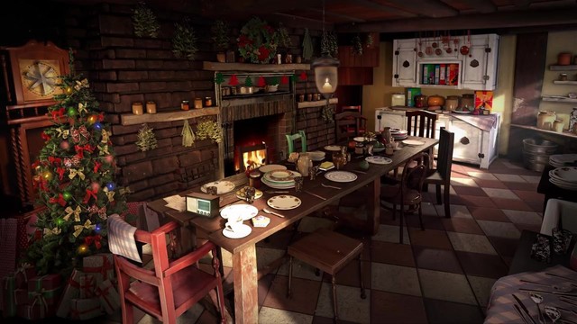 房间中间有个圆形的矮桌,矮桌有一根脚断了,下面用书垫了起来。矮桌上面有很多草纸,矮桌周围还有各种大箱小箱和各种不知名的材料。