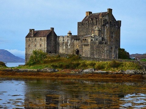 三人一路飞到一座很大的湖水上方,岸上有一座很古老的城堡。
