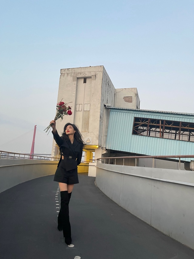 【视频内容是在江边的栈道上手中拿着花大胆向前走,吹吹晚风。】