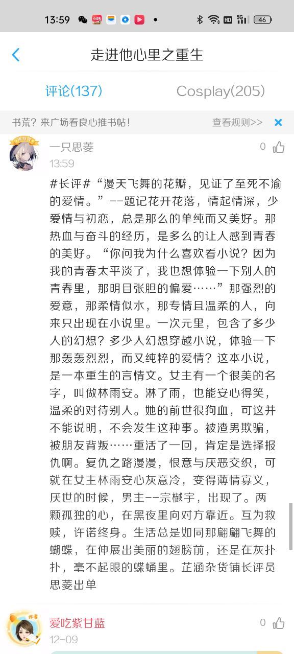 花开花落,情起情深,少爱情与初恋,总是那么的单纯而又美好。那热血与奋斗的经历,是多么的让人感到青春的美好。“你问我为什么喜欢看小说?因为我的青春太平淡了,我也想体验一下别人的青春里,那明目张胆的偏爱……”那强烈的爱意,那柔情似水,那专情且温柔的人,向来只出现在小说里。一次元里,包含了多少人的幻想?多少人幻想穿越小说,体验一下那轰轰烈烈,而又纯粹的爱情?这本小说,是一本重生的言情文。女主有一个很美的名字,叫做林雨安。淋了雨,也能安心得笑,温柔的对待别人。她的前世很狗血,可这并不能说明,不会发生这种事。被渣男欺骗,被朋友背叛……重活了一回,肯定是选择报仇啊。复仇之路漫漫,恨意与厌恶交织,可就在女主林雨安心灰意冷,变得薄情寡义,厌世的时候,男主--宗樾宇,出现了。两颗孤独的心,在黑夜里向对方靠近。互为救赎,许诺终身。生活总是如同那翩翩飞舞的蝴蝶,在伸展出美丽的翅膀前,还是在灰扑扑,毫不起眼的蝶蛹里。芷涵杂货铺长评员思菱出单