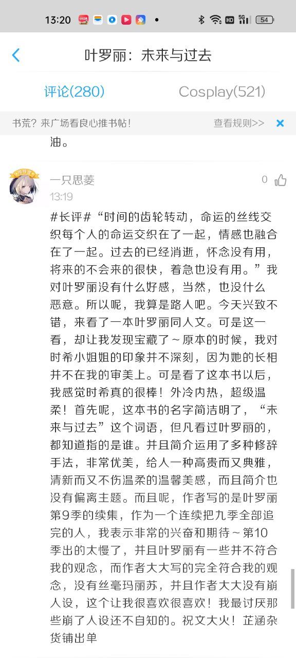 铺长思菱#长评#“时间的齿轮转动,命运的丝线交织每个人的命运交织在了一起,情感也融合在了一起。过去的已经消逝,怀念没有用,将来的不会来的很快,着急也没有用。” 我对叶罗丽没有什么好感,当然,也没什么恶意。所以呢,我算是路人吧。今天兴致不错,来看了一本叶罗丽同人文。可是这一看,却让我发现宝藏了~原本的时候,我对时希小姐姐的印象并不深刻,因为她的长相并不在我的审美上。可是看了这本书以后,我感觉时希真的很棒!外冷内热,超级温柔!首先呢,这本书的名字简洁明了,“未来与过去”这个词语,但凡看过叶罗丽的,都知道指的是谁。并且简介运用了多种修辞手法,非常优美,给人一种高贵而又典雅,清新而又不伤温柔的温馨美感,而且简介也没有偏离主题。 而且呢,作者写的是叶罗丽第9季的续集,作为一个连续把九季全部追完的人,我表示非常的兴奋和期待~第10季出的太慢了,并且叶罗丽有一些并不符合我的观念,而作者大大写的完全符合我的观念,没有丝毫玛丽苏,并且作者大大没有崩人设,这个让我很喜欢很喜欢!我最讨厌那些崩了人设还不自知的。祝文大火! 芷涵杂货铺出单
