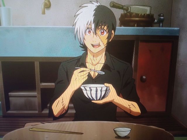 间黑男:好了好了,下面是(拿起盛着饭的碗,用筷子拨进去)咖喱配乌冬和米饭都很棒。(拿着勺子吃起来,一脸兴奋的样子)