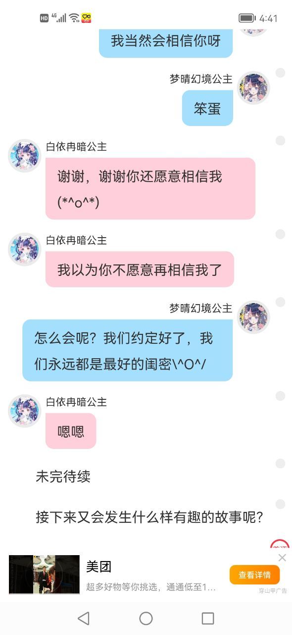 梦晴幻境公主当然可以呀,刚才说着玩呢(怎么回事?心好痛呀😭,我今天到底怎么回事儿呀?冰冰,要跟我处闺蜜,我不应该高兴嘛,为什么那么难受?到底怎么回事呀?我必须要调查清楚,姐姐们肯定不会告诉我的,我还是自己调查清楚吧!)