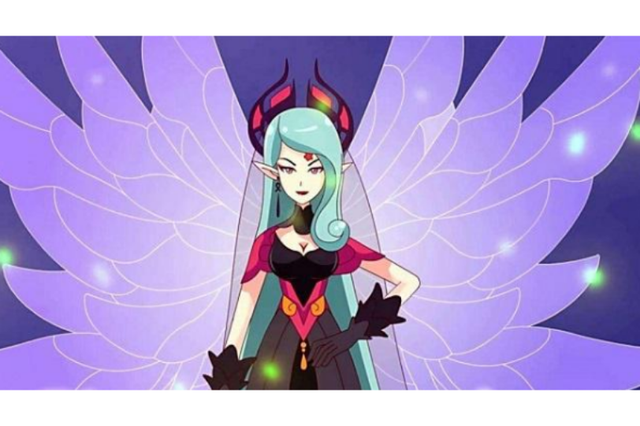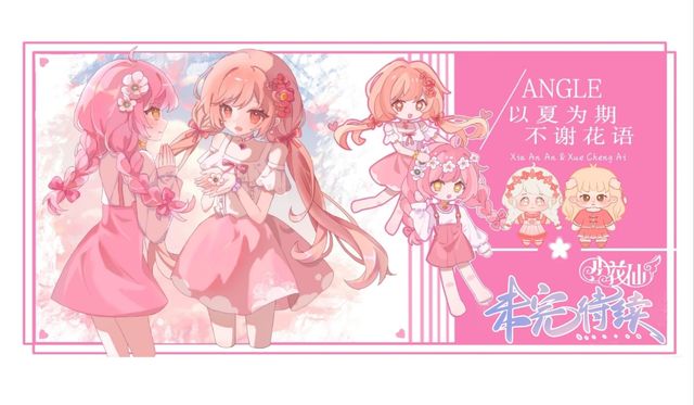 浅绿色长发挽起,饰以粉白花瓣型发饰、红色皇冠、身穿紫红连衣裙,腰间装饰着粉白色花瓣。 深紫衬裙、黑色丝袜紫红鞋子拿着扇子落在地面。