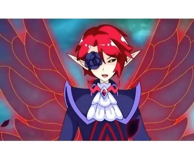 手指修长、肤色白净赤红头发,黑色单瞳另外是纯黑玫瑰、精灵耳朵,身穿着燕尾服礼服携带根黑玫瑰手杖。赤红色的翅膀带夹着黑暗。