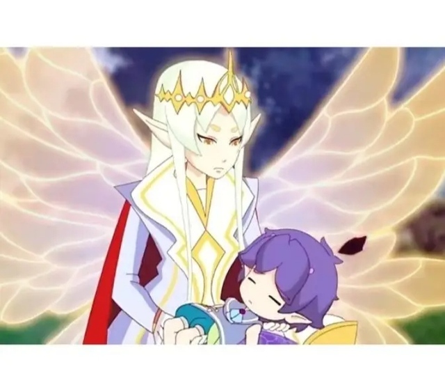 半蹲着雪白长发、末端金色曼陀罗、精灵耳朵前两侧细长发丝, 洁白衣领金黄边纹、浅紫色的礼服, 深红斗篷金色翅膀、带夹着淡粉,低头看着怀中的库库鲁。