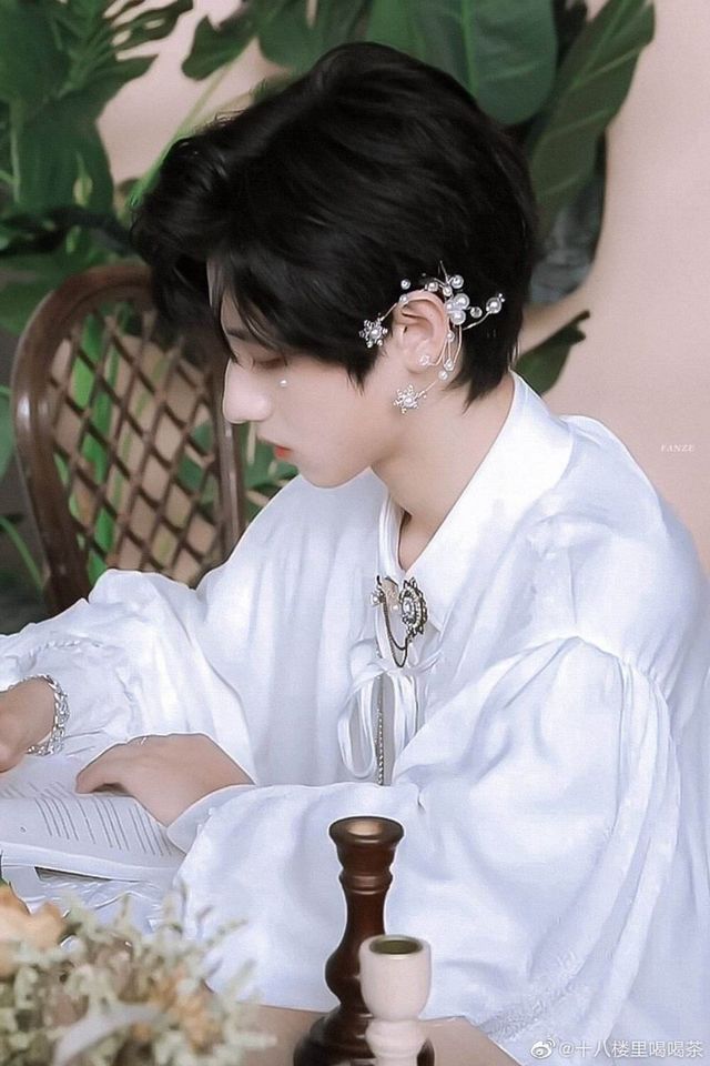 一个男孩突然从身后出现,洁白的衣服穿在身上显得他更加清纯,坐在椅子认真地看着书。