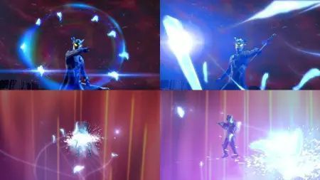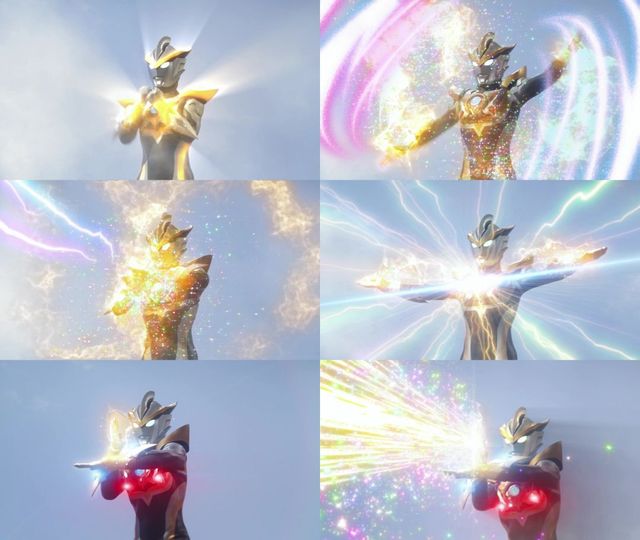 捷德奥特曼·银河初升银河冲击波「捷德从全身释放出光子能量,同时也融入了银河的水晶之光、艾克斯的电子之光以及欧布的圆环之光。在背后出现欧布之环和X型电子光芒后,在面前出现星系状光芒,射出一道缠绕红黑色闪电的月牙状蓝白色光线」
