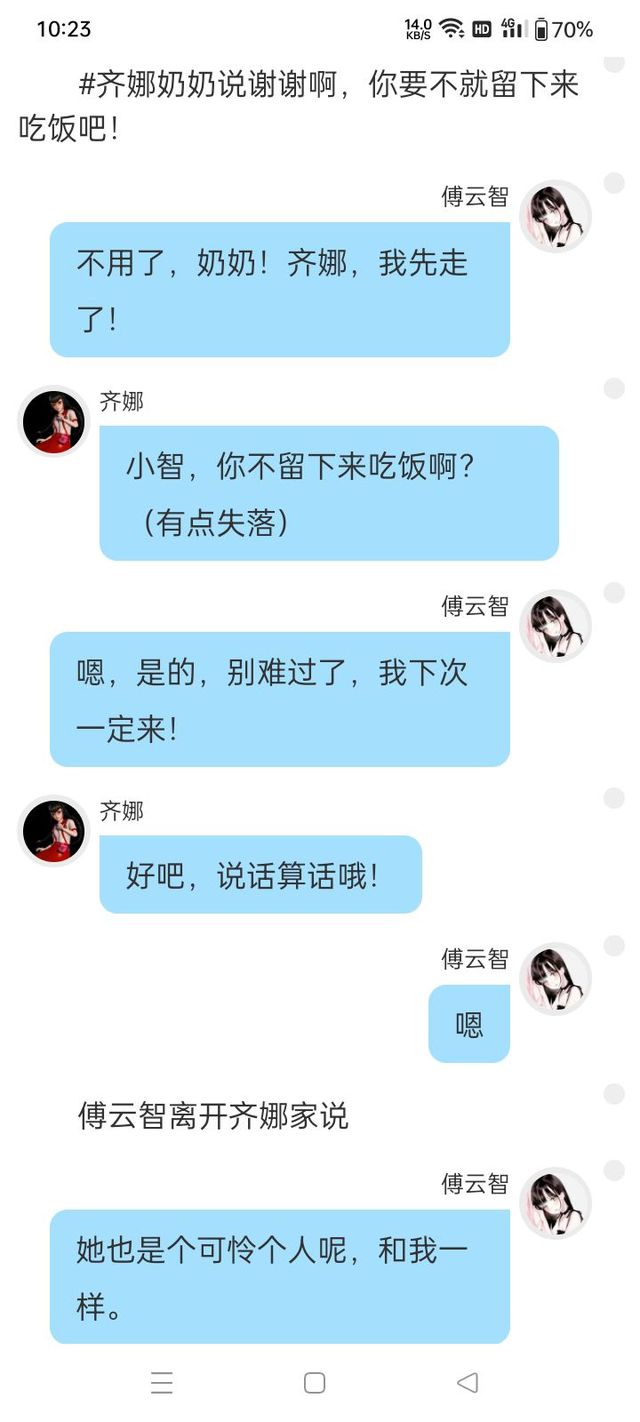 齐娜“(低着头,小声说到)我真的……可以吗……好吧……谢谢蕊蕊……”