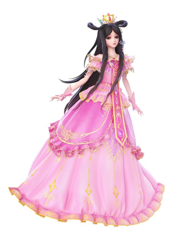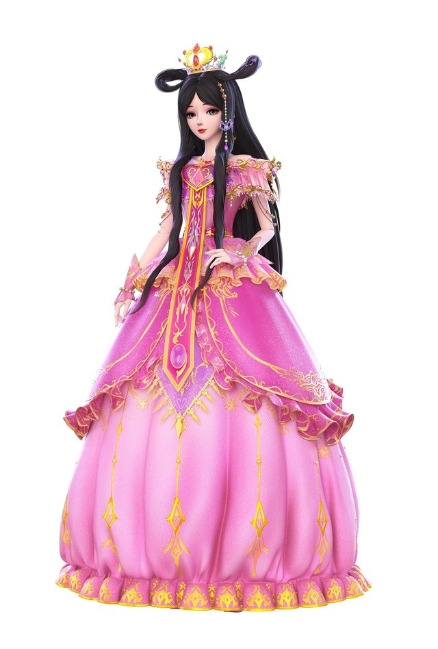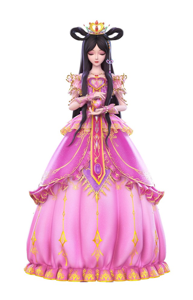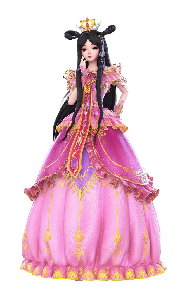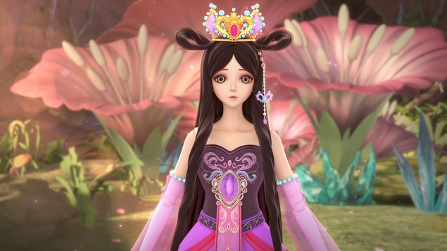 乌黑秀丽的双平髻秀发,那秀发还泛着美丽的紫色反光,头戴花蕾冠,耳挂金叶耳坠,身穿镶金公主裙。