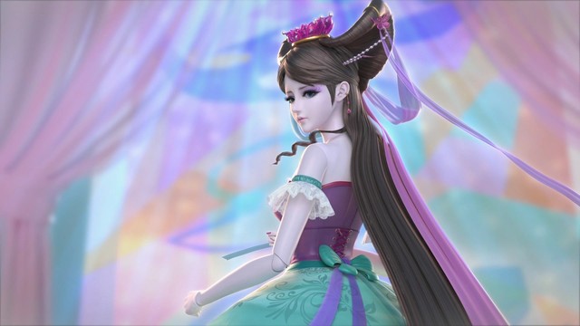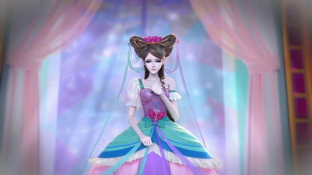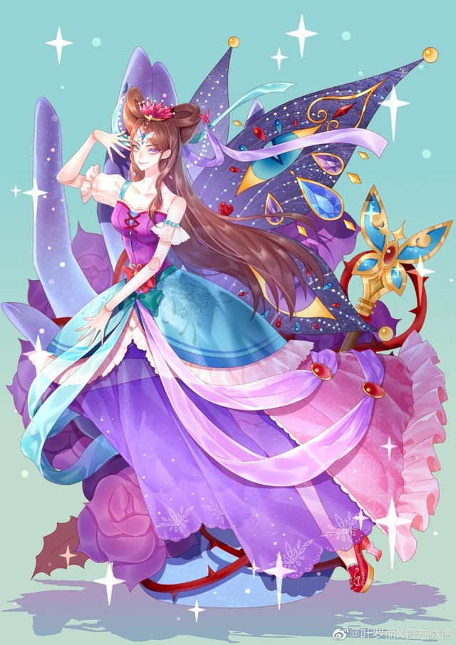 一头蝴蝶盘发的棕发,头戴紫罗兰水晶冠,紫兰双色蝴蝶丝带吊坠,一副粉色眼罩。单边泡泡袖,蓝绿色与粉色紫色相间的大蓬蓬裙,一双恨天高粉紫色水晶鞋。