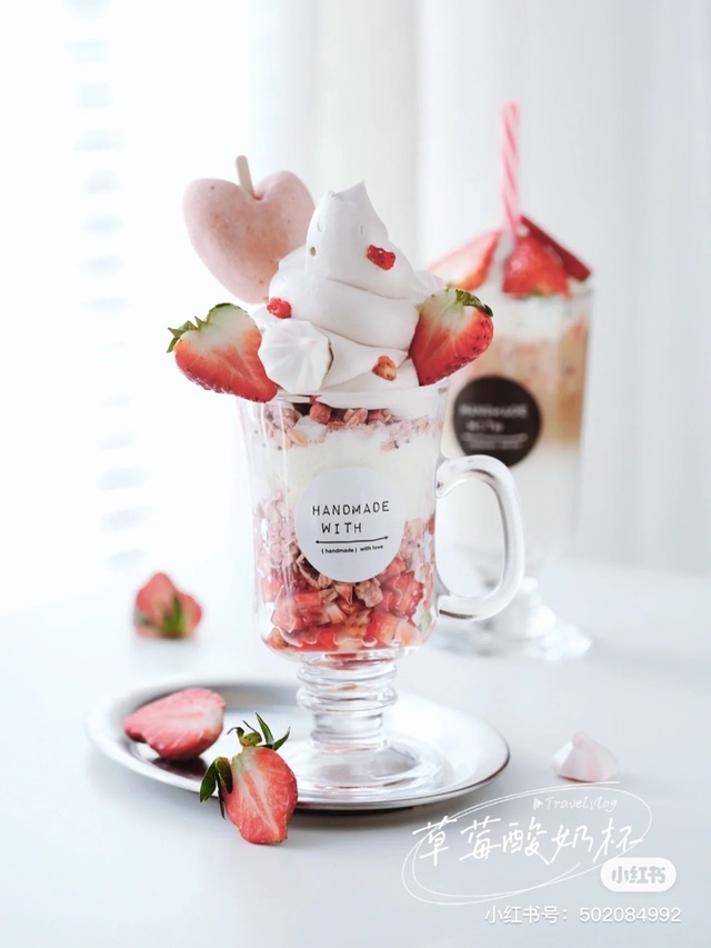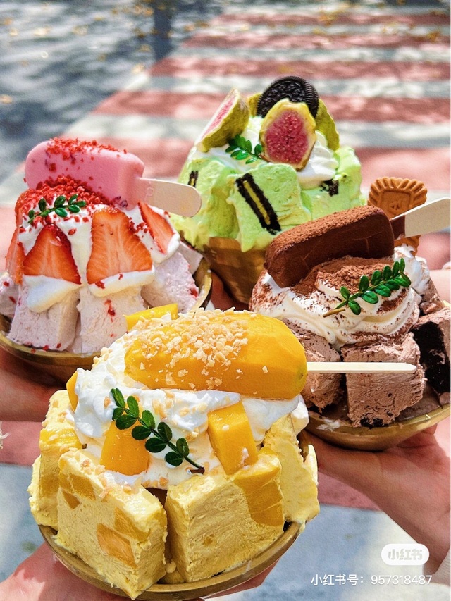茉莉这是厚切酸奶牛乳冰,我一共做了四种口味,有芒果口味的上面还有一个大芒果,还有草莓口味的,上面是梦龙的草莓冰淇淋,巧克力口味的,还有抹茶口味的