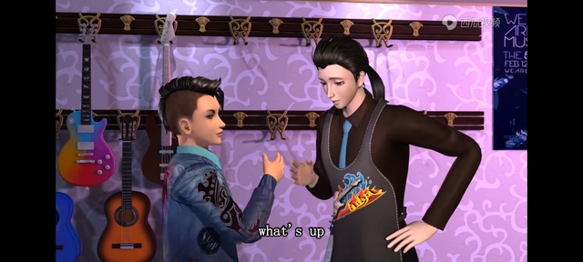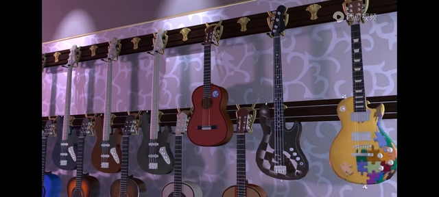 陈思思看见墙上挂满了的乐器惊叹:哇!这么多电吉他啊!
