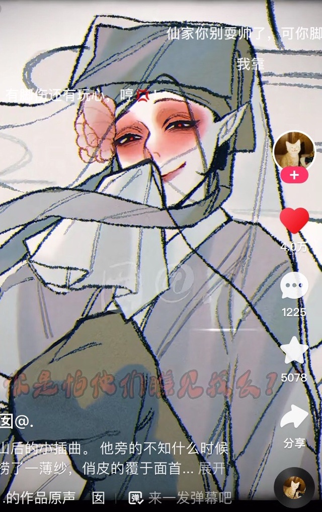 他旁的不知什么时候尽捞了一薄纱,俏皮的覆于面首,斜坐于瓦砾之上任凤吹动翻扬丝缎,好似谪仙。
