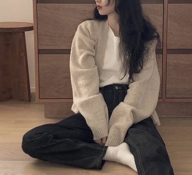 今天的穿着也十分日常,米色针织开衫配干净的白T恤。
