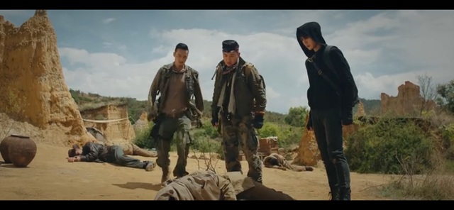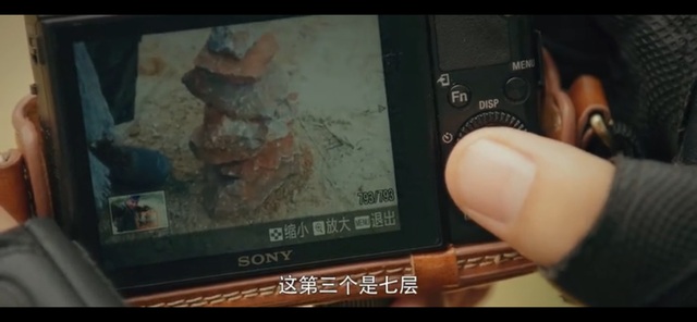 这时小哥蹲在地上观察者石堆,胖子把相机拿出来看着