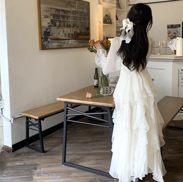 你呢也是穿着一件米白色荷叶边长袖雪纺公主连衣裙