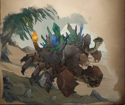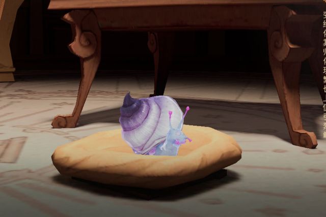 两只巨大的紫色蟾蜍坐在那里狼吞虎咽地大吃死丽蝇,吃得口水滴答滴答直流。一只大得吓人的乌龟待在窗户旁边,背上的壳像宝石一样闪闪发亮(火螃蟹的说)。