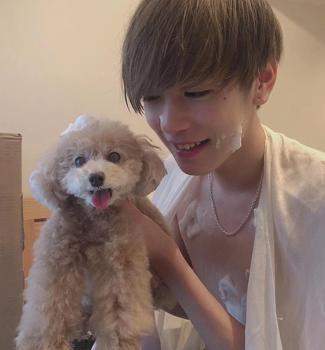 只见内藤秀一郎赤裸着上身,仅披一件薄浴巾,腹肌上还挂着沐浴露的泡沫,怀里抱着小狗哆哩。