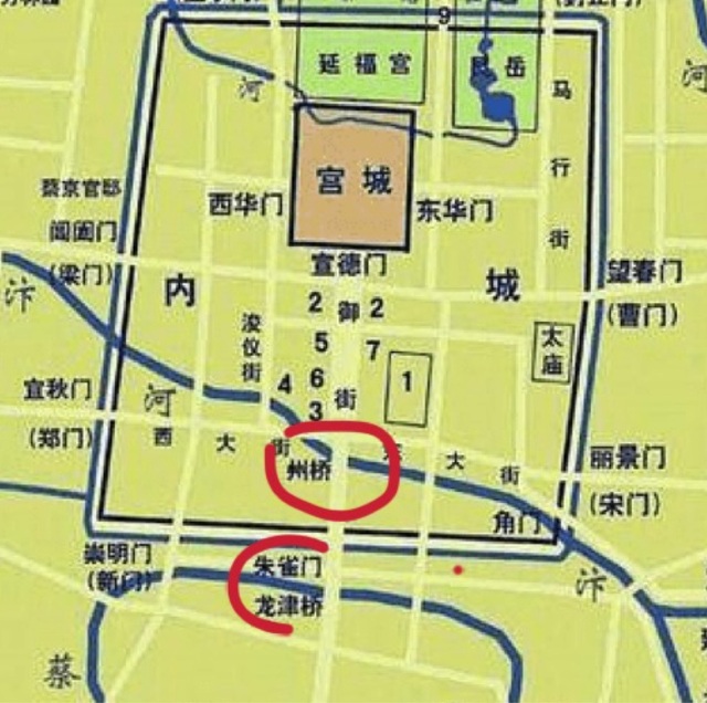 说是州桥夜市,其实范围远不止州桥。州桥在朱雀门里内城,夜市范围则从州桥南一直延伸到朱雀门,再从朱雀门至外城的龙津桥。(可见下图标红)
