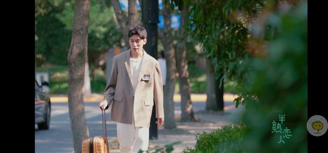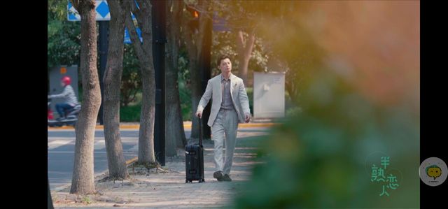 他拿着黑色行李箱,身穿白色西装缓缓走来