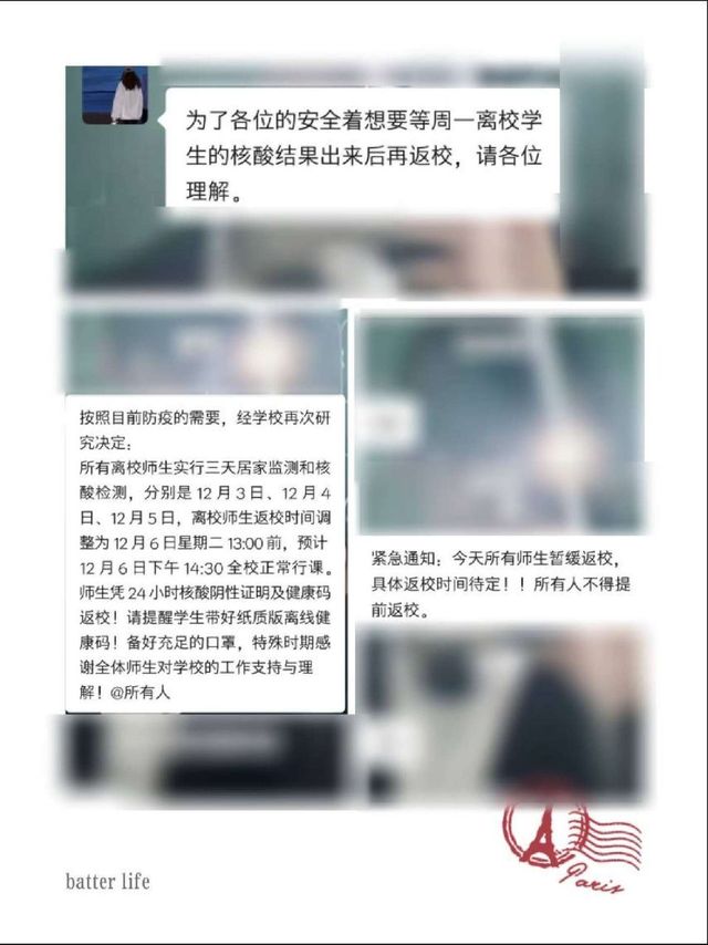 作者刚开始觉得还好,星期日大家就返校了,一拖拖到星期一,我想我忍了大不了星期一他们就返校吗,结果又改到星期二,我忍不了,但是我一想啊,明天就星期二了,还好,结果今天星期二早上一打开手机就是这条消息,暂缓回校,他就不能让我们留校生回家吗,我家离得近啊,因为不是老师,我至于在这吗!!!