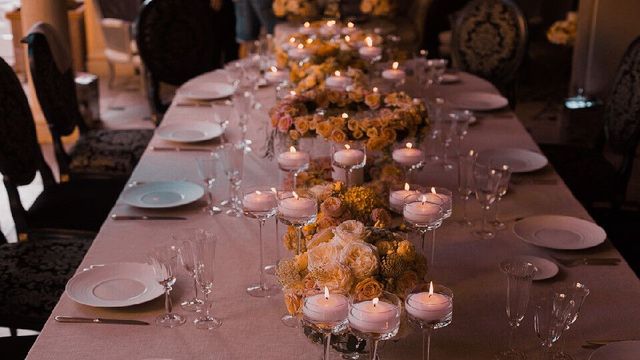 房间里华丽的水晶吊灯,暖黄色的光洒在中间长桌上,长长的桌子上铺着华丽的桌布,在桌子中间摆放着一个精致的水晶花瓶,里面插了一束鲜花,周围摆着的玲琅满目美味佳肴,黄色灯光洒在当中