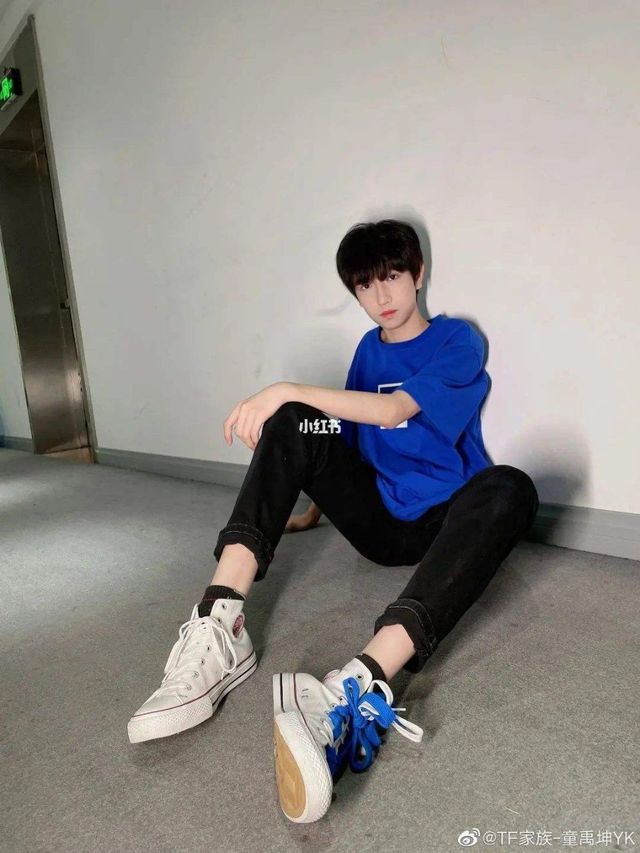 童禹坤穿了一件蓝色的T恤和一条黑色的休闲裤